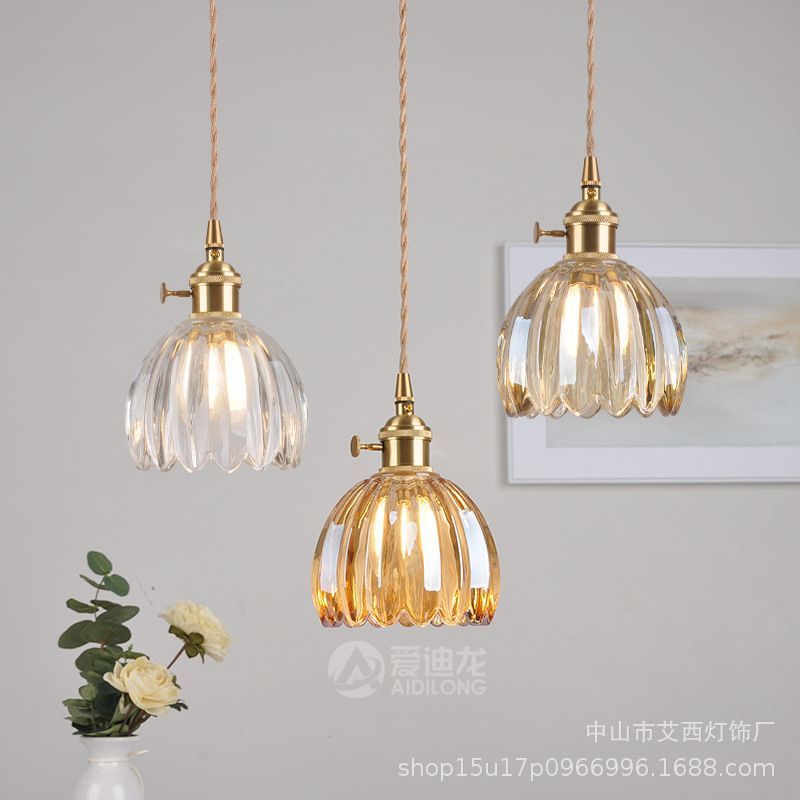 Lampu Dinding Kamar Tidur Bunga Kecil Bunga Amber Kaca Tembaga Retro Gaya Jepang Lampu Gantung Sederhana Teh Susu Nordic untuk Restoran