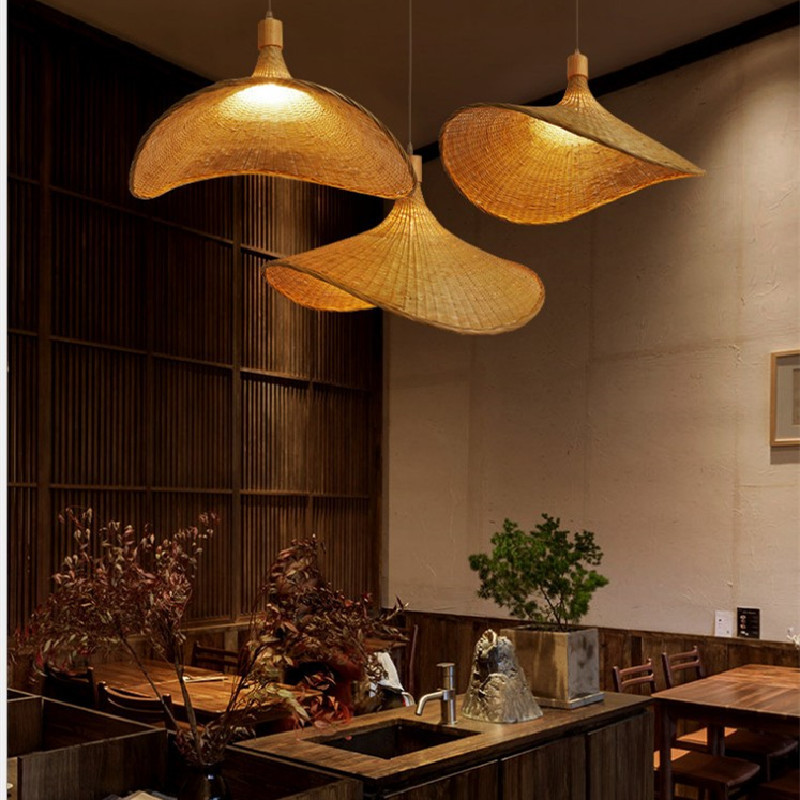 Lampu gantung anyaman bambu baru lampu gantung toko pakaian lampu topi jerami kepribadian kreatif lampu Jepang Asia Tenggara Zen ruang teh Tiongkok