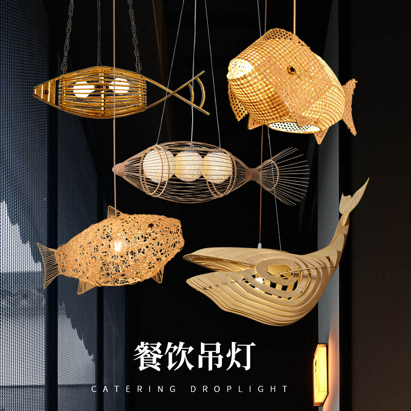 Lampu gantung bentuk ikan bambu, lampu rotan kayu Jepang toko B & B toko ikan bakar restoran pot panas kertas kreatif pedesaan