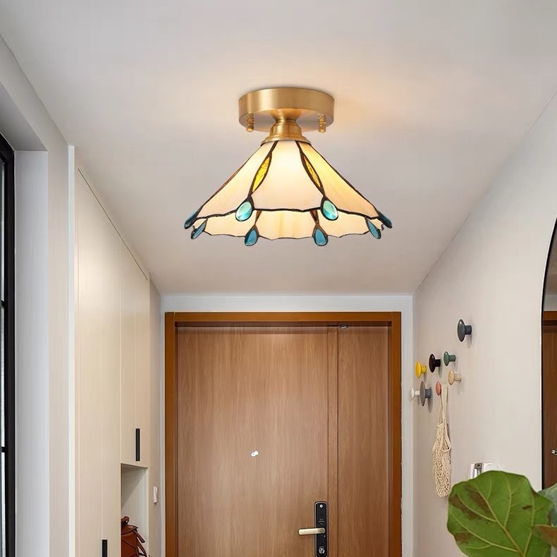 Lampu plafon kecil gaya Eropa, 20CM lampu Tiffany mewah berwarna kaca lorong koridor balkon lampu langit-langit Mediterania kuning dan putih kotak-kotak