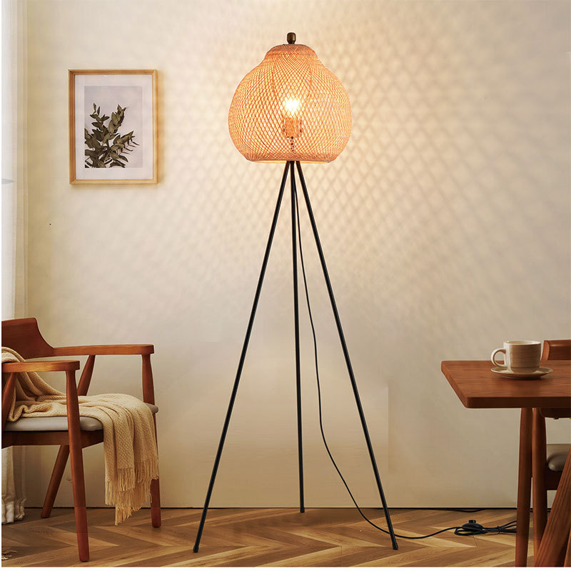 Lampu lantai bambu gaya Tiongkok, lampu lantai bambu sederhana lampu meja ruang tamu lampu rotan gaya Jepang senyap lampu tiga garpu