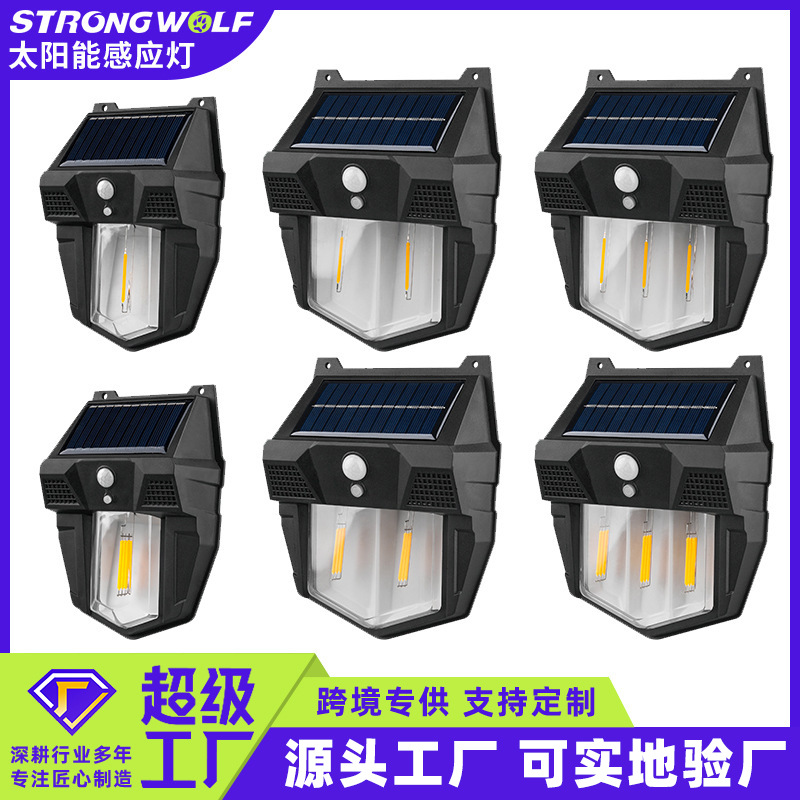 Lampu dinding tenaga surya luar ruangan dengan kecerahan tinggi dan sensor gerak, lampu filamen tungsten untuk jalan, halaman, lanskap vila, lampu malam tahan air.