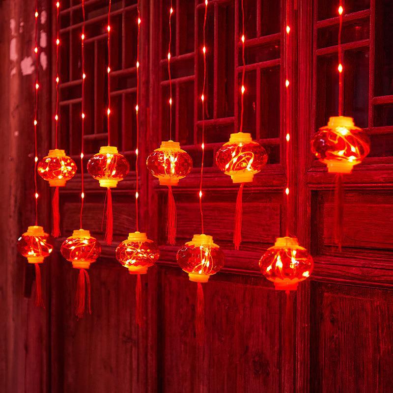 Lentera merah dekorasi festival Musim Semi, lampu warna-warni tirai delapan fungsi Tahun Baru garis kulit rumah balkon halaman plat pintu