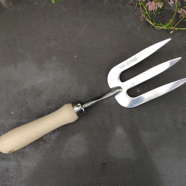 Alat berkebun kayu solid, peralatan berkebun praktis gagang kayu Stainless steel piring tiga garpu bunga dan sayuran