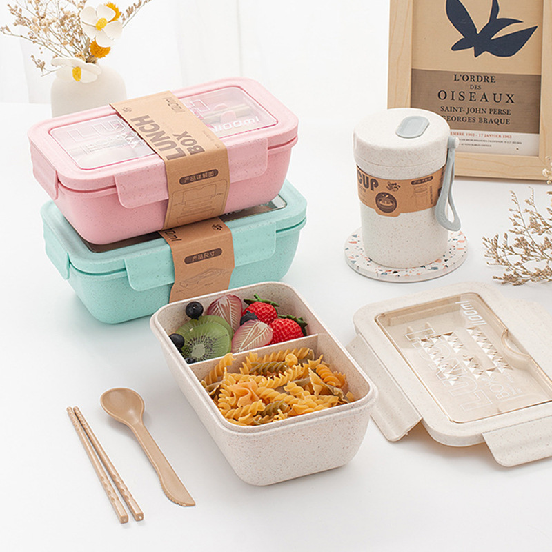 Kotak makan siang pelajar, kotak makan siang pengurang lemak dengan peralatan makan, kotak makan siang pelajar portabel, sedotan gandum, oven microwave, pemanas, kantor, pekerja, kotak makan siang dengan pengurang lemak