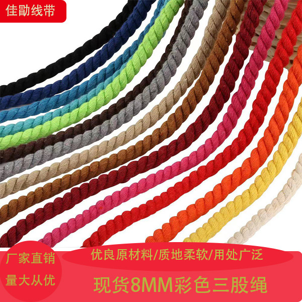 Tali katun tiga untai warna-warni 8mm tali katun murni aksesori pakaian tali putar taman kanak-kanak tali dekorasi DIY