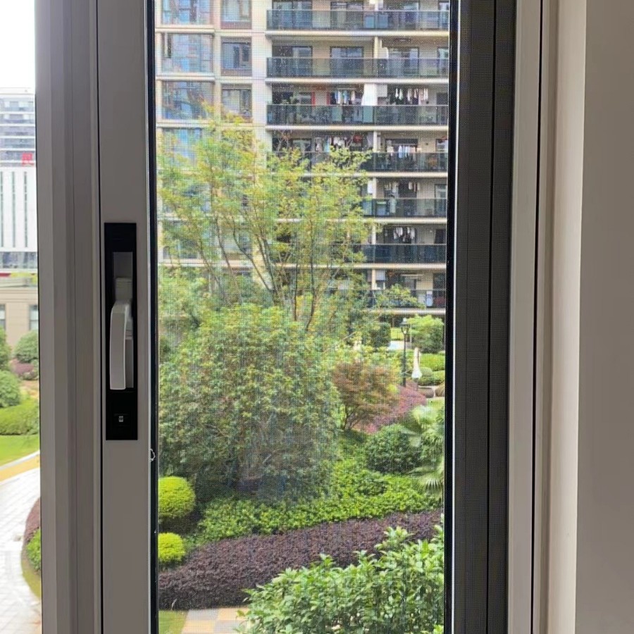 Penutup geser kunci saku tepi sempit anti-maling jendela layar pasang sendiri jendela Luar baja emas anti-nyamuk kasa transparan tinggi jaring berlian dapat dilepas dan dicuci