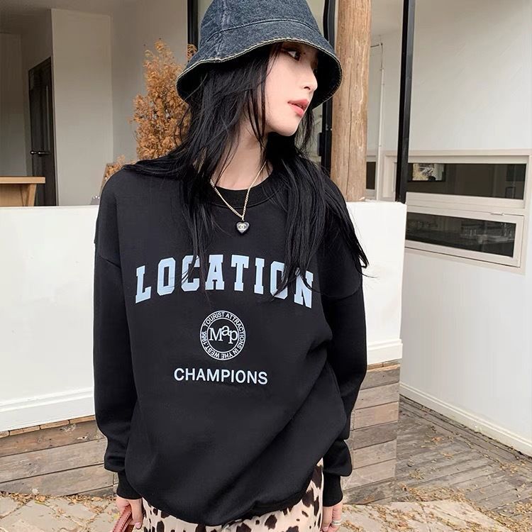 Atasan retro Amerika musim gugur dan musim dingin 2025, sweatshirt beludru leher bulat bermotif untuk wanita, gaya Korea, lengan panjang, longgar, kasual