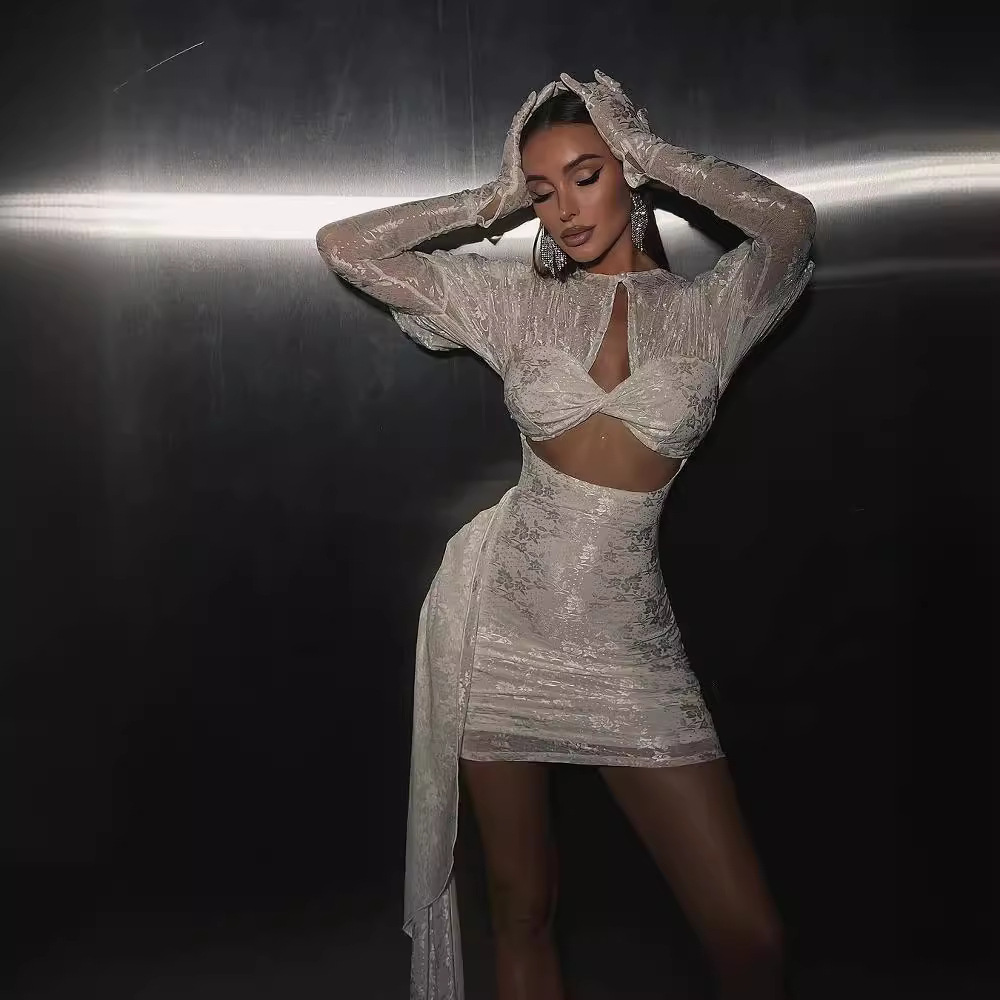 欧美跨境新款不规则褶皱包臀纯色裙镂空连衣裙春夏设计感女装批发