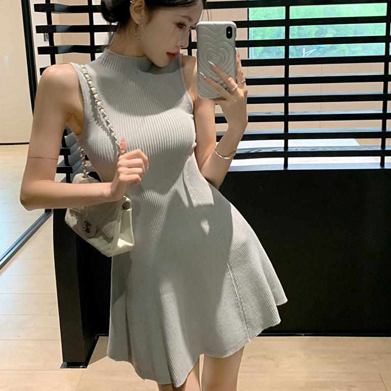 Gaun rajut tanpa lengan gaya Perancis, Gaun wanita rajut tanpa lengan, rok pendek a-line pinggang ramping elegan baru musim panas