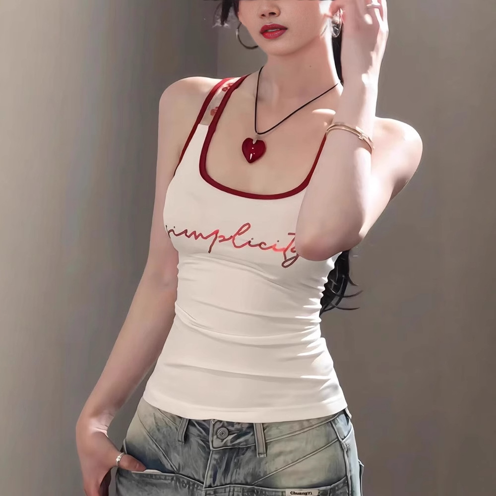 Atasan Tanpa Lengan Gaya Liburan Slim Fit Gaya Desain Luar Musim Panas Wanita Tank-top Tali Huruf I Wanita Model Amerika
