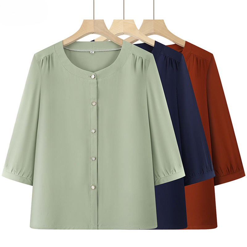 Kemeja Ibu Pakaian Musim Panas Model Baru Kemeja Elegan Pakaian Wanita Setengah Baya dan Tua Lengan 3/4 Kemeja Kecil Sifon Model Tipis