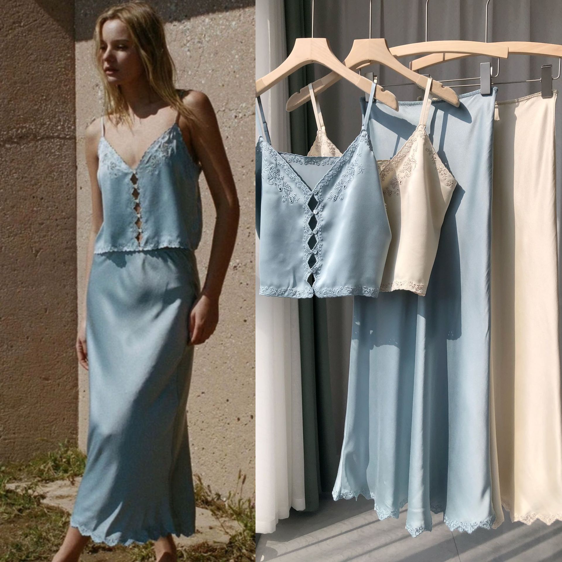 Haiyan White Sands · D0en Lembut dan Intelektual Sulaman Tali Bordir Sutra Miring Rok Sutra