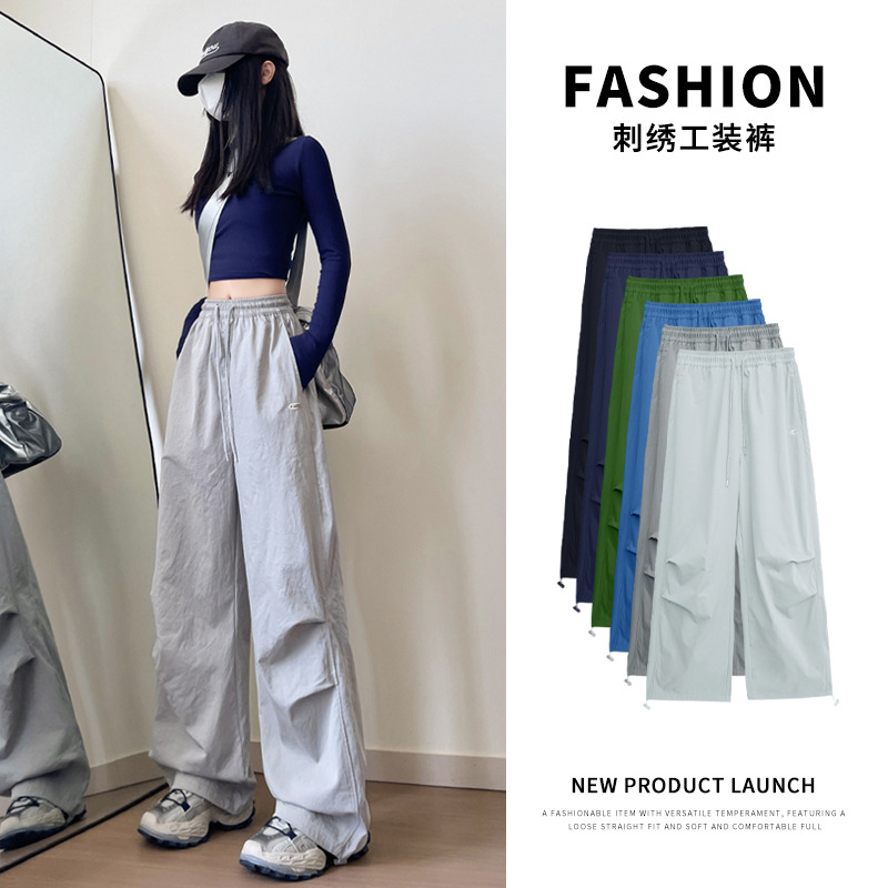 美式速干刺绣工装运动裤女春秋新款宽松高腰显瘦垂感休闲阔腿长裤