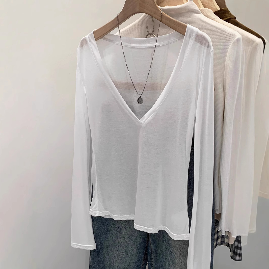 Kaus Lengan Panjang Kerah V Kasual Gaya Malas Longgar Laisselle Atasan Baju Pelindung Terik Matahari Tipis Model Baru Wanita