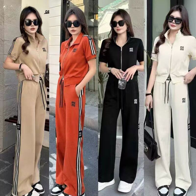 Kardigan Rajutan Ritsleting Warna Kombinasi Produk Eropa Celana Kaki Lebar Olahraga Kasual Musim Panas Wanita Lengan Pendek Set Dua Potong Gaya Barat