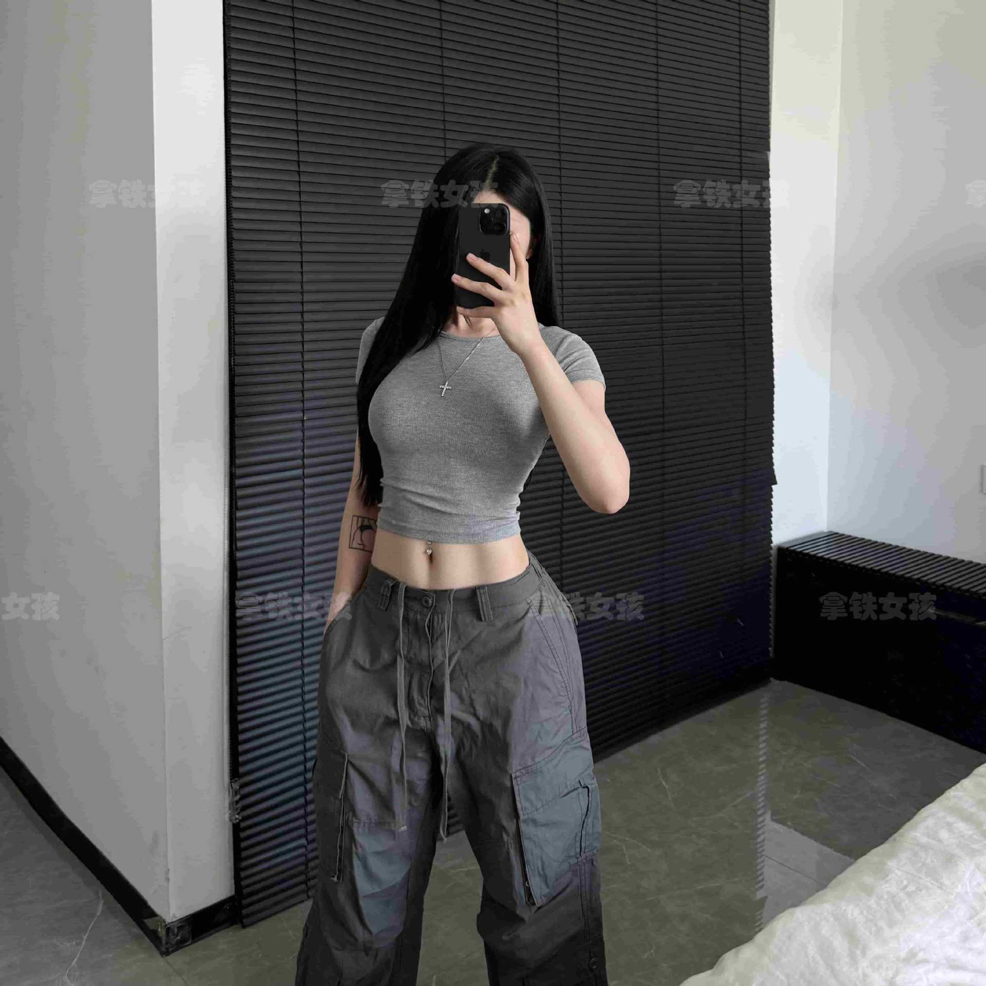 Kaus Kerah Bulat Bahu Gadis Latte Atasan Ketat Slim Fit Dalaman Pas Badan Terbuka Pusar Musim Panas Model Pendek Lengan Pendek Wanita