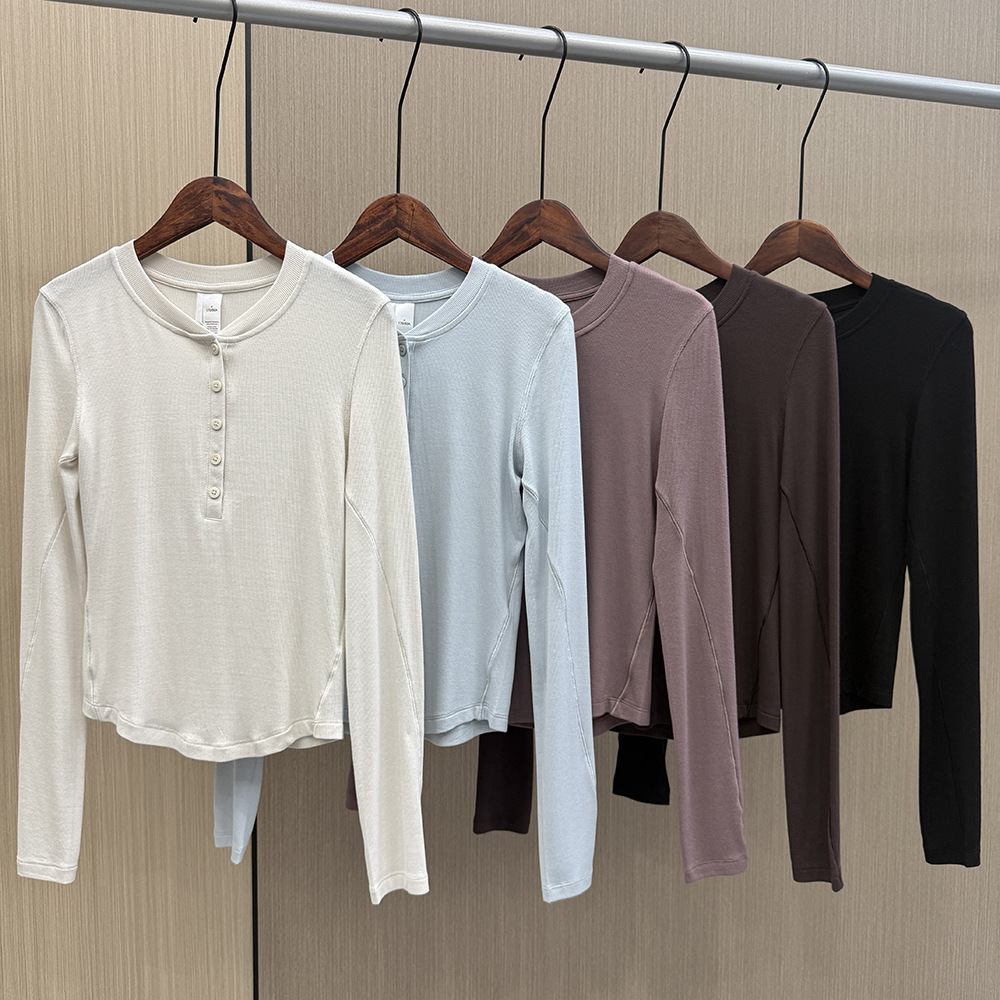 Kemeja Henley Lulu Autumn slim fit lengan panjang dengan kerah kancing dan desain ribbed yang meniruskan bentuk tubuh, gaya komuter terbaru.