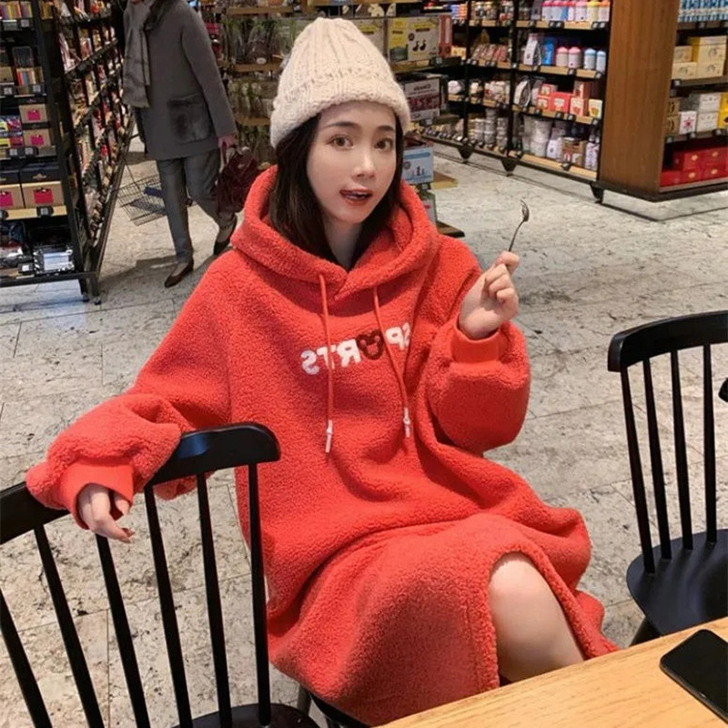 Gaya baru musim gugur dan musim dingin 2025, imitasi kasmir, longgar, ukuran besar, hangat, panjang selutut, hoodie berkerudung, gaun serbaguna.