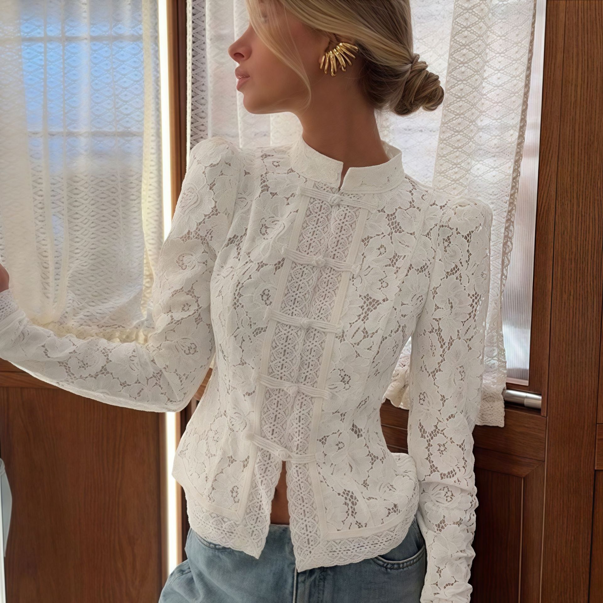 Kemeja renda kerah kecil model baru Eropa dan Amerika dari AliExpress dengan kancing pengencang pinggang, atasan berongga yang serbaguna dan modis, dapat bernapas, 2025.