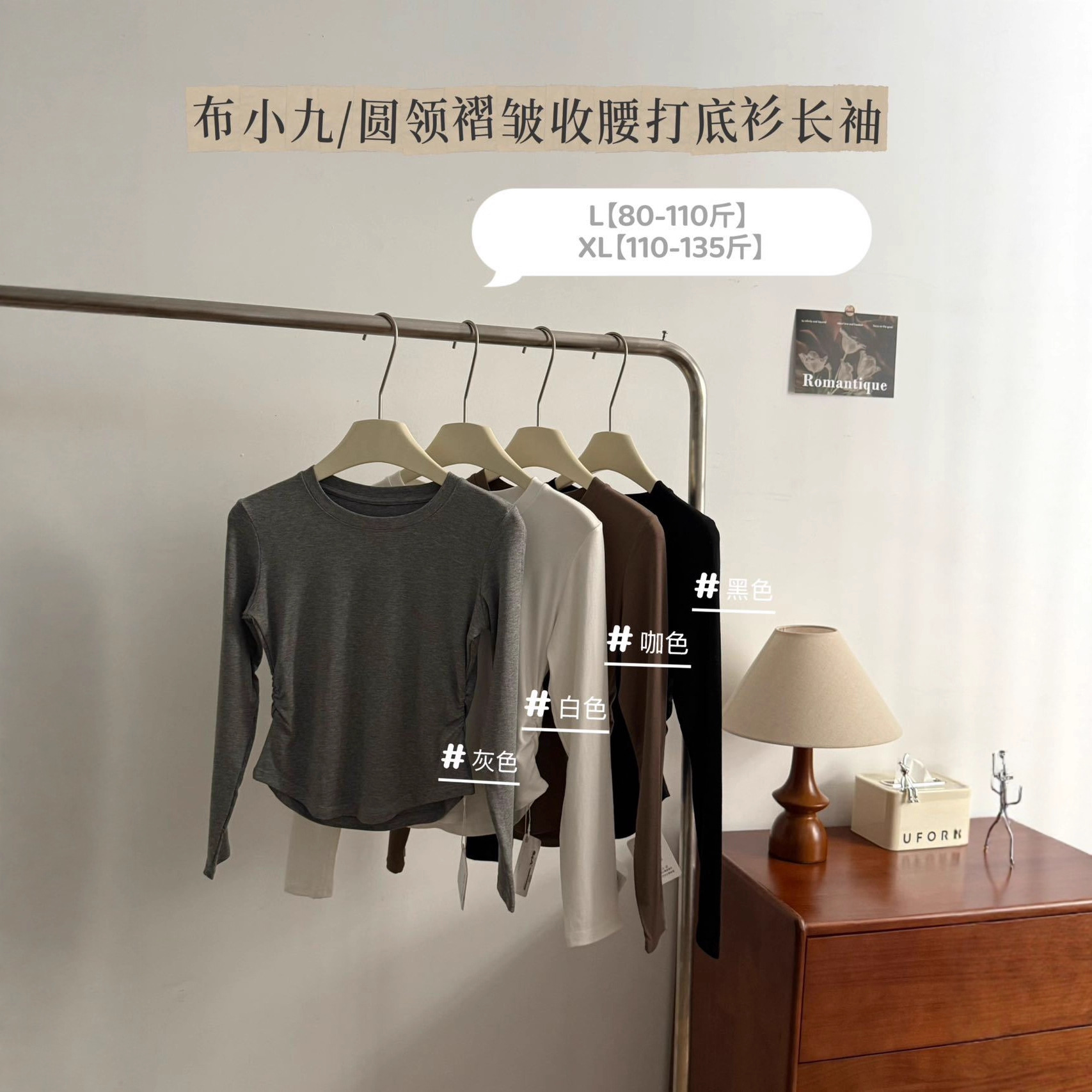 布小九/圆领褶皱收腰打底衫女生修身长袖纯色百搭圆领长袖T恤上衣
