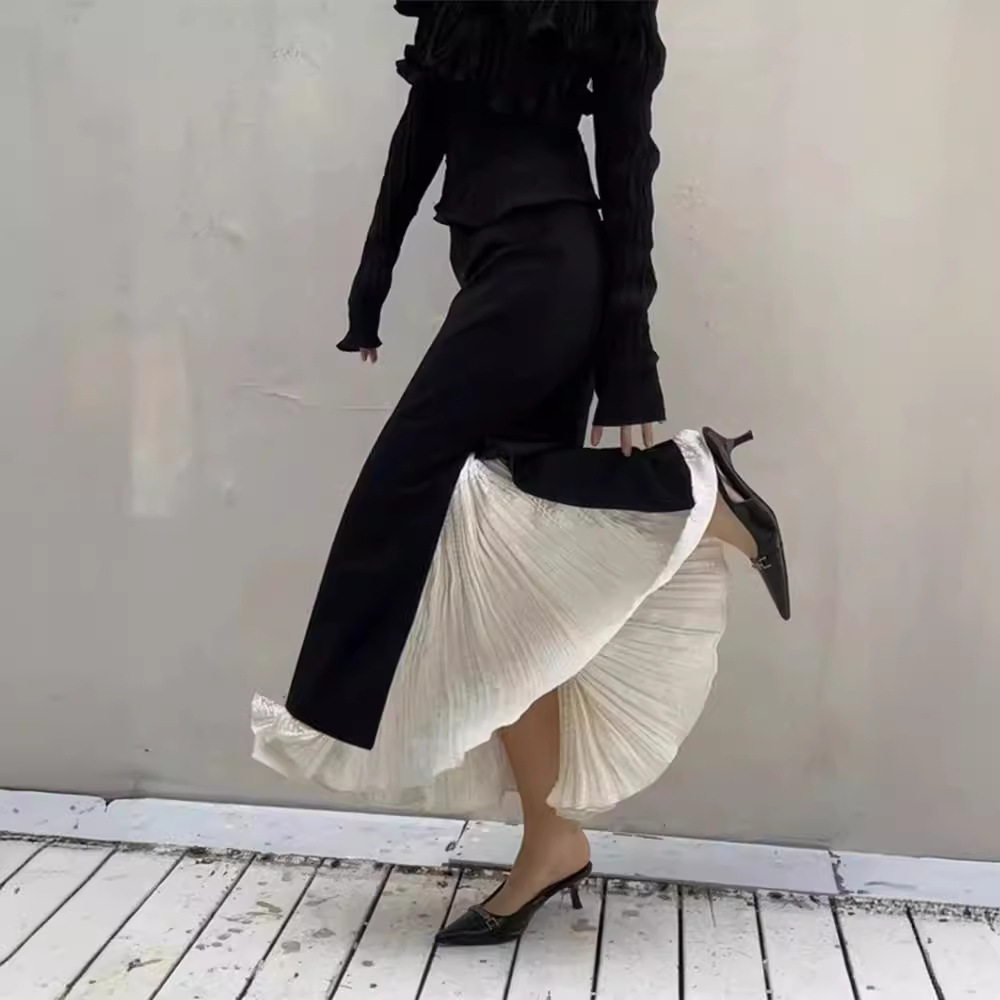 Desain niche elegan Inggris 2024 musim gugur baru rok kontras lipit jahitan mode elegan pinggang tinggi untuk wanita.