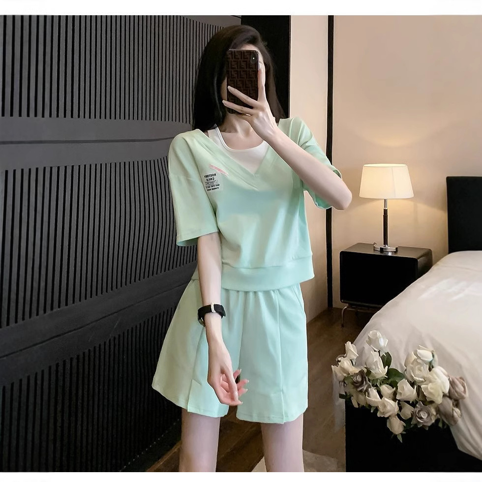 Setelan Olahraga Kasual Wanita Trendi Kaus Lengan Pendek Terlihat Kurus Longgar Model Baru Musim Panas Celana Pendek Kaki Lebar Pinggang Tinggi Setelan Dua Potong
