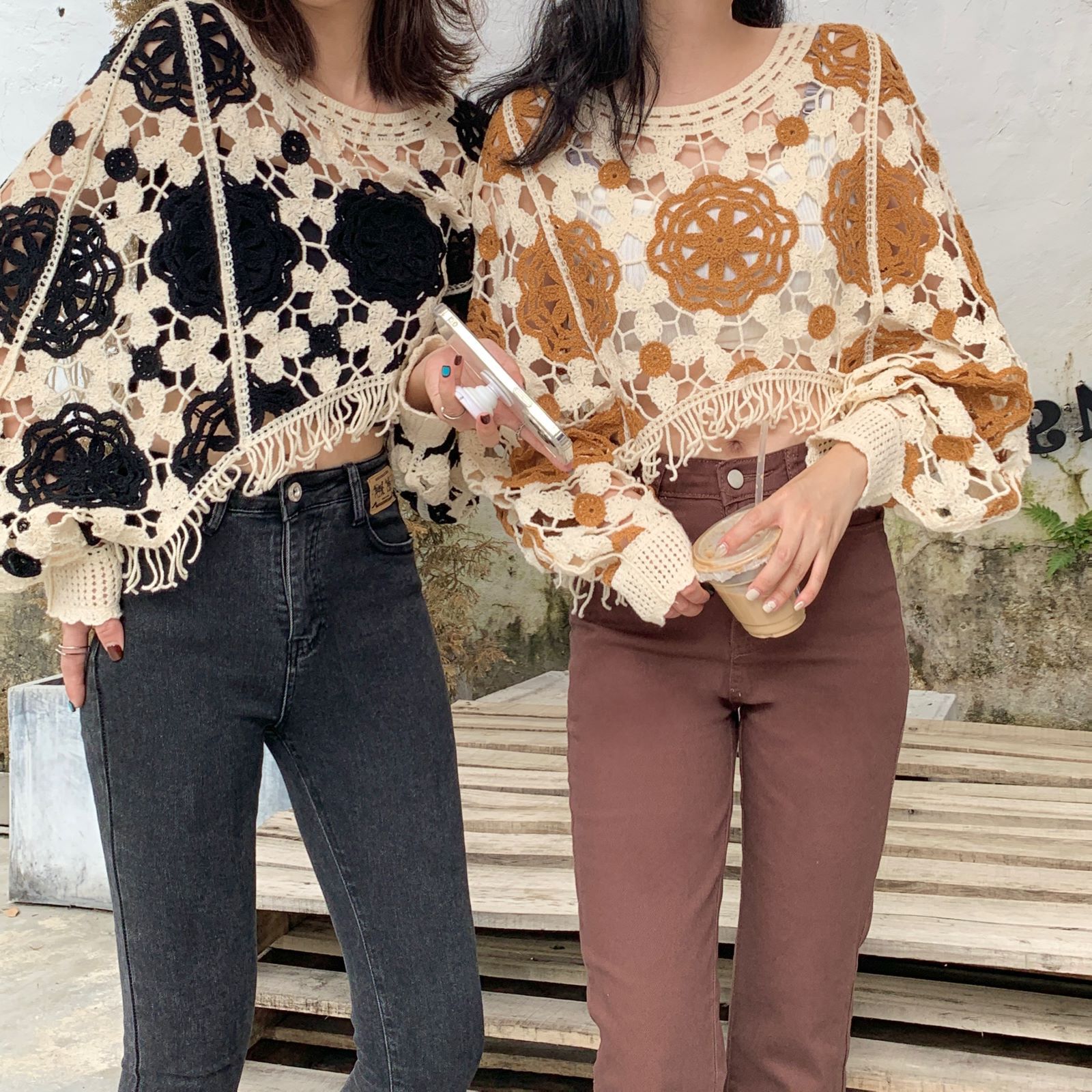 Pakaian wanita Eropa dan Amerika musim gugur model etnik baru fashion elegan buatan tangan rajutan rumbai longgar sweater lengan panjang blus