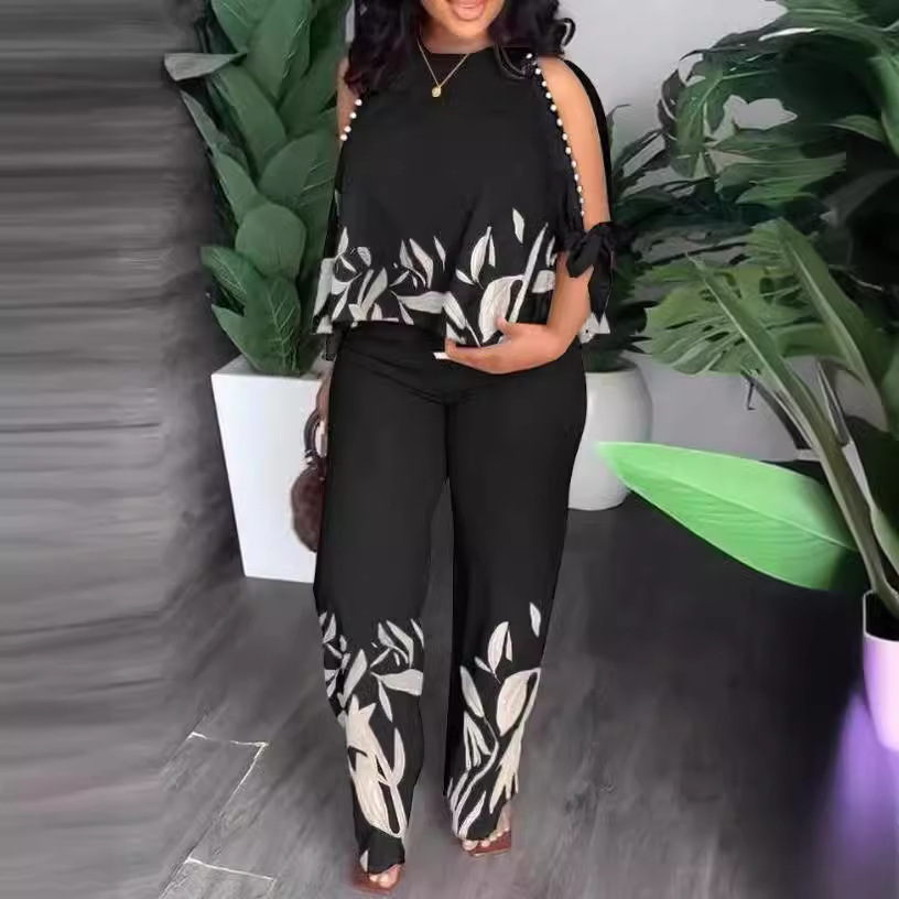 Raglan setelan wanita leher bulat, setelan celana panjang Motif manik-manik lengan setengah Eropa dan Amerika 2023
