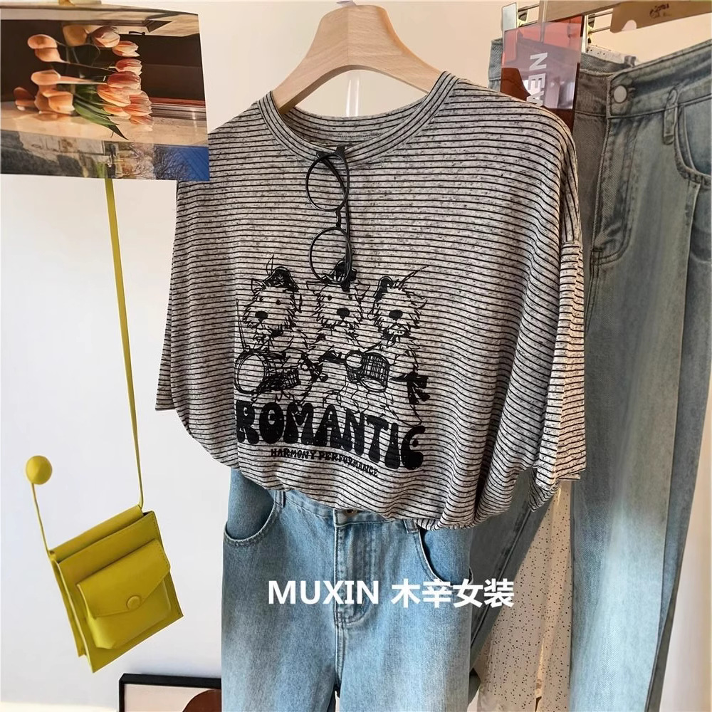 [Dua Buku Jahitan] Ukuran Besar 240Kg Tiga Anak Anjing Bergaris Tipis Longgar Musim Panas Lengan Pendek Wanita