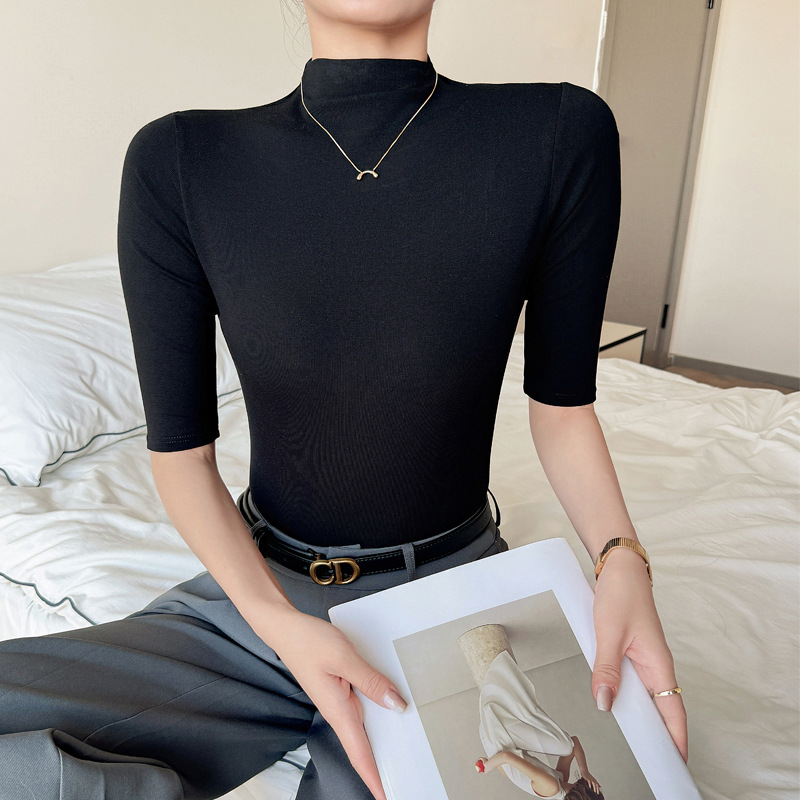 Kaus Bahu setengah lengan turtleneck modal Musim Semi dan Musim Gugur Atasan Wanita ukuran plus gaya Korea kaus desain