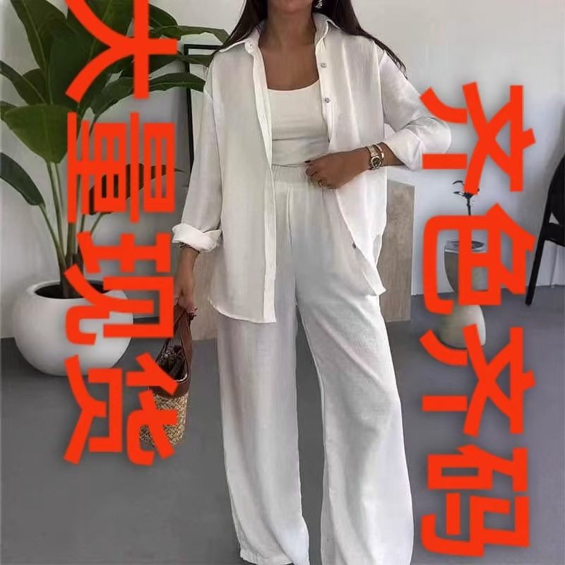 Amazon Fashion Lintas Batas Musim Semi dan Musim Panas Longgar Lengan Panjang Berukuran Satu Kemeja Warna Polos Pakaian Wanita Ukuran Besar Set Celana Panjang Kasual Wanita