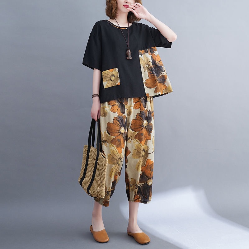 Atasan pelangsing longgar wanita trendi retro baru musim panas 2023 celana crop cetak wanita terkenal ukuran plus