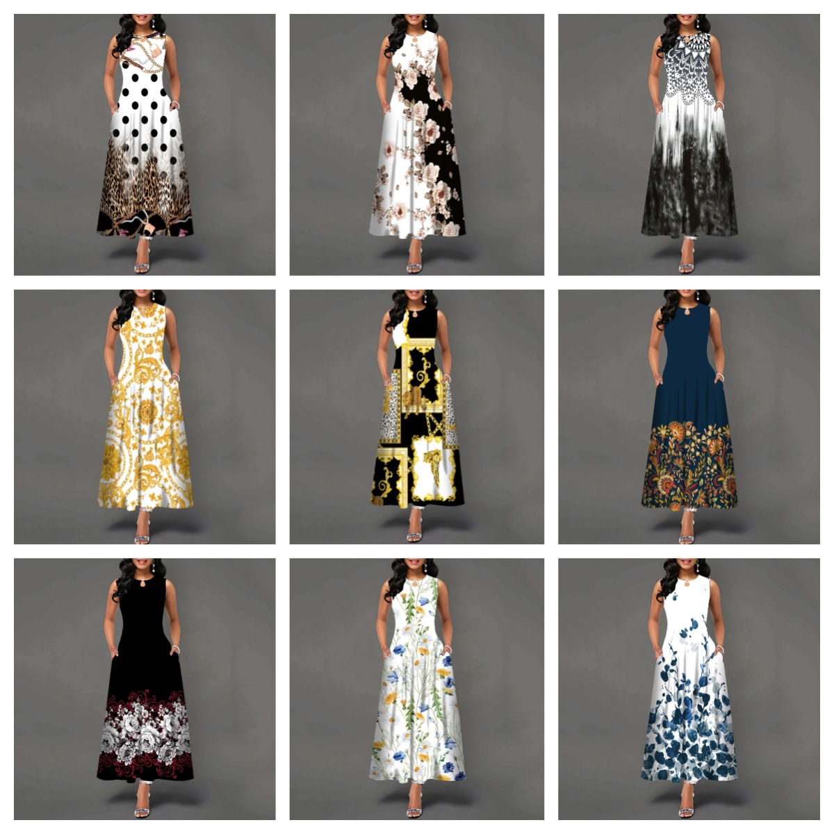 Gaun panjang tanpa lengan leher V motif 3D, gaun musim panas lintas batas Eropa dan Amerika populer baru