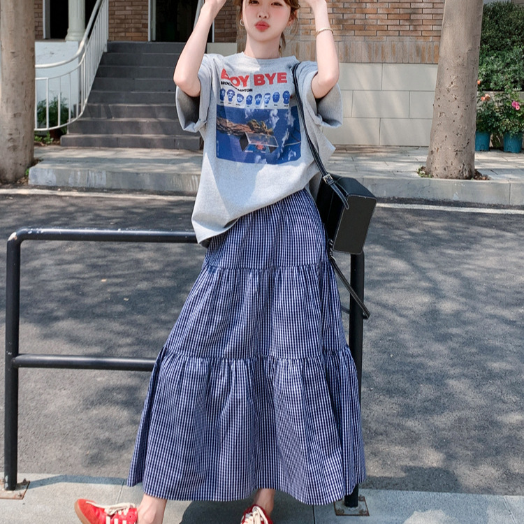 Set T-shirt Wanita Bersablon Gaya Santai 300Kg Ukuran Besar Wanita Gemuk Rok Setengah Badan Kotak-Kotak Pinggang Tinggi Model Baru Musim Panas Dua Set