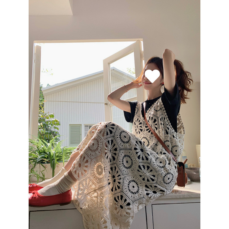 Gaun Berongga Bunga Kait Retro Musim Panas Ukuran Besar 300Kg Wanita Gemuk Rok T-shirt Hitam Dua Set 2 Pakaian Wanita