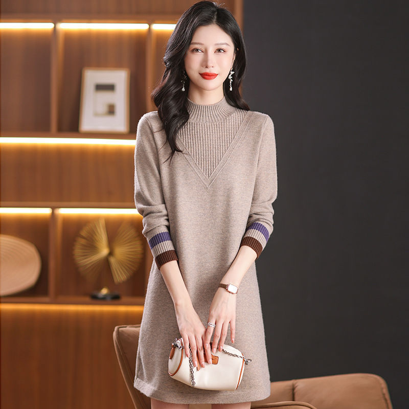 Baju Dalaman Tebal Kerah Setengah Tinggi Atasan Rajutan Ukuran Besar Ibu Longgar Musim Gugur Musim Dingin Gaya Barat Wanita Rok Sweater Luar Model Setengah Panjang
