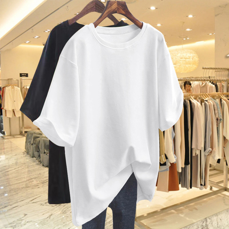 Atasan Katun Murni Wanita Musim Panas Model Panjang Sedang Menutupi Bokong Tubuh Bagian Bawah T-shirt Model Panjang Sedang Hilang