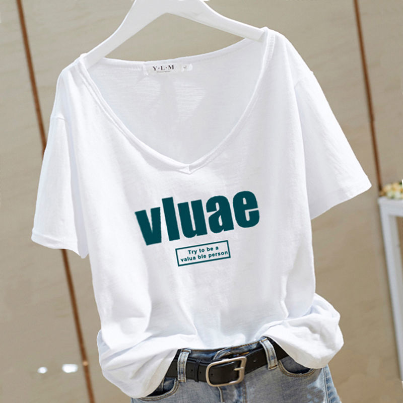 Kaus katun leher V lengan pendek wanita, Atasan kemeja dasar serbaguna ukuran plus pelangsing longgar gaya Korea baru Musim Panas 2024