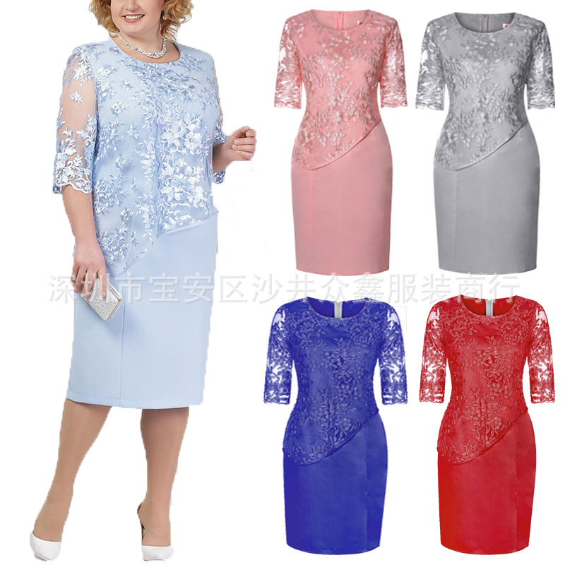 Gaun lengan setengah besar wanita, gaya Eropa dan Amerika ukuran besar AliExpress baru jahitan renda palsu dua potong set gemuk lengan setengah