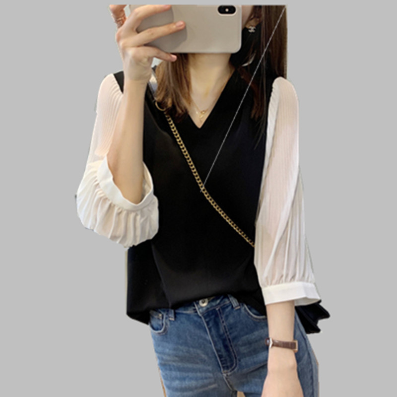 Kemeja sifon gaya Hong Kong, lipit tiga perempat lengan untuk wanita ukuran plus, pakaian musim panas kerah V penutup perut pelangsing