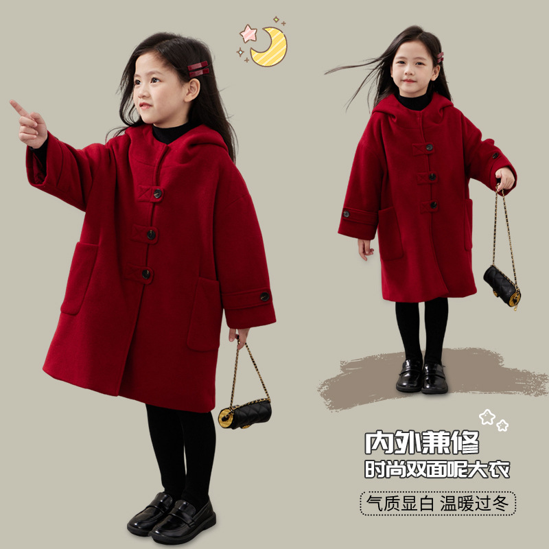 图图小象女童冬秋款呢子大衣连帽保暖2025新款洋气中长款童装外套