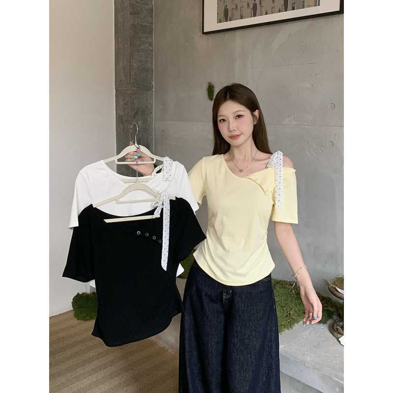 T-Shirt Lengan Pendek Lengkungan Bahu Terbuka Bertali Ikatan Kupu-Kupu Ukuran Besar Wanita Gemuk Model Baru Musim Panas 2025