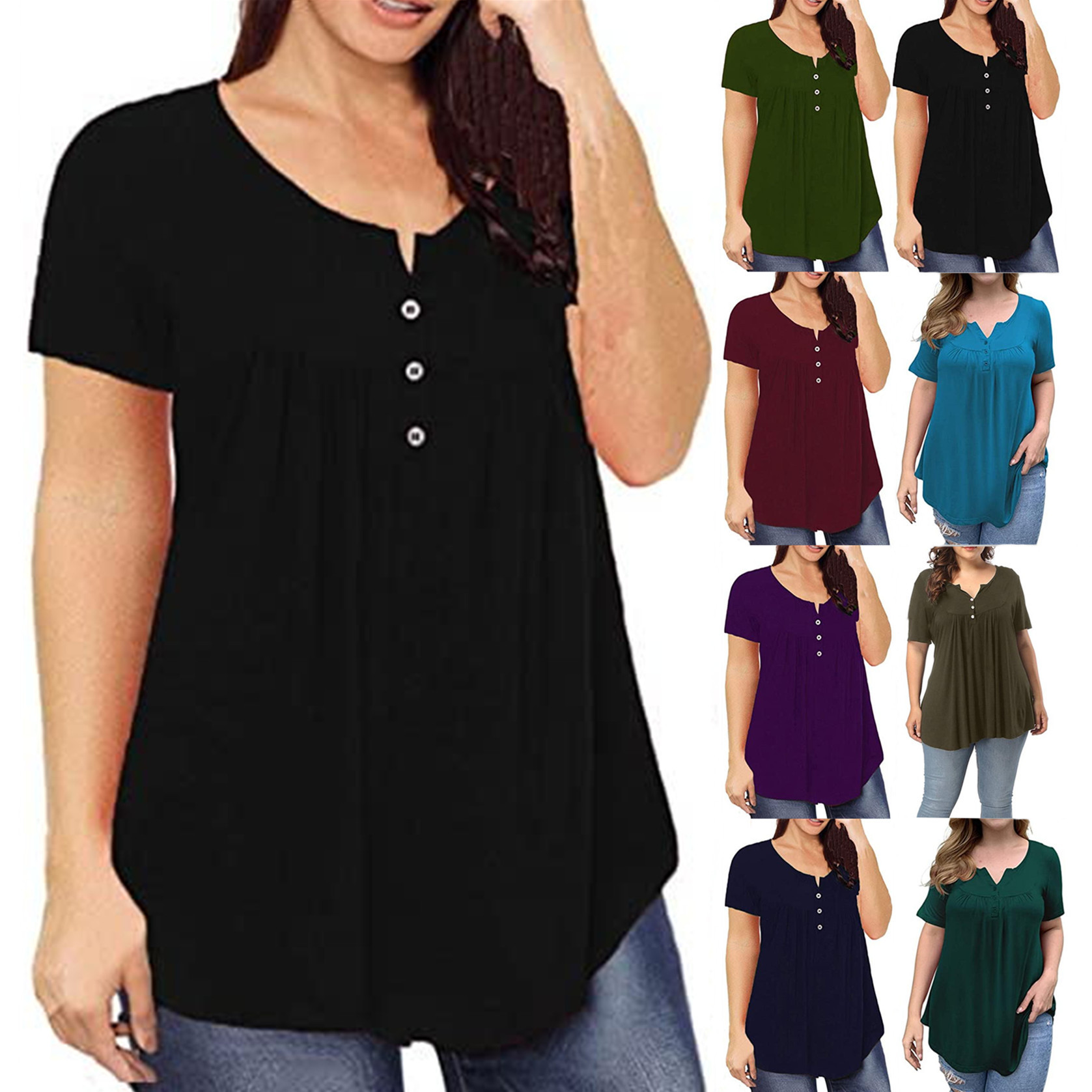 AliExpress ebay Amazon Wish Musim Panas Eropa Amerika Kerah V Rajut Warna Polos T-shirt Lengan Pendek Longgar Ukuran Besar Pakaian Wanita