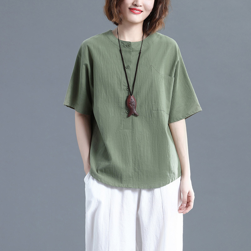 Baju katun linen wanita lengan pendek, baju atasan wanita linen kasual longgar ukuran besar artistik musim panas untuk perempuan