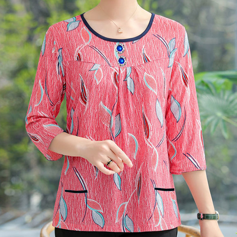 Kaos oblong wanita berbahan sutra es premium dengan motif cetak, ukuran besar untuk ibu, model leher bulat, cocok untuk musim panas 2025.