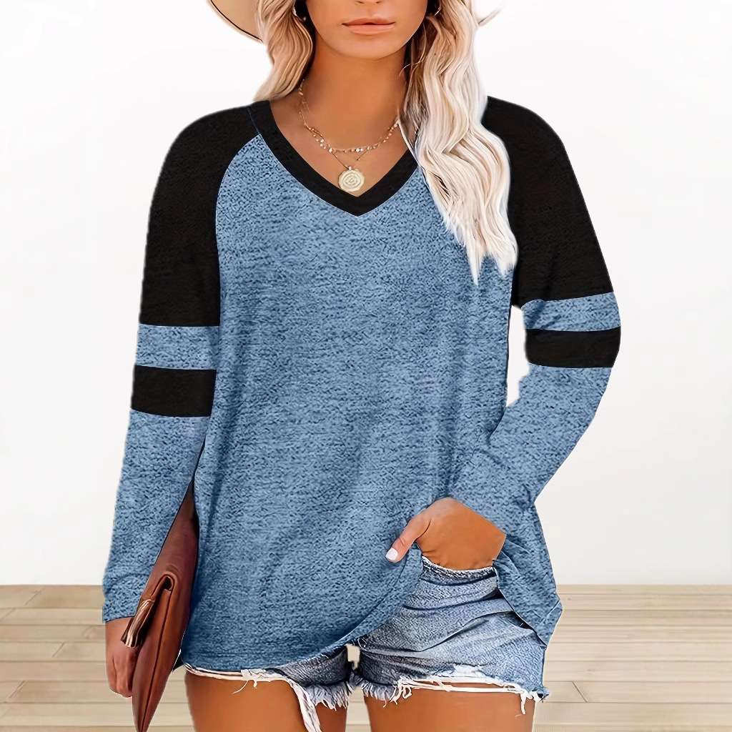 2025 Pakaian Wanita Perdagangan Luar Negeri Eropa dan Amerika T-shirt Lengan Panjang Longgar Ukuran Besar Warna Kontras Motif Cetak Digital Kerah V Santai Musim Semi Musim Gugur