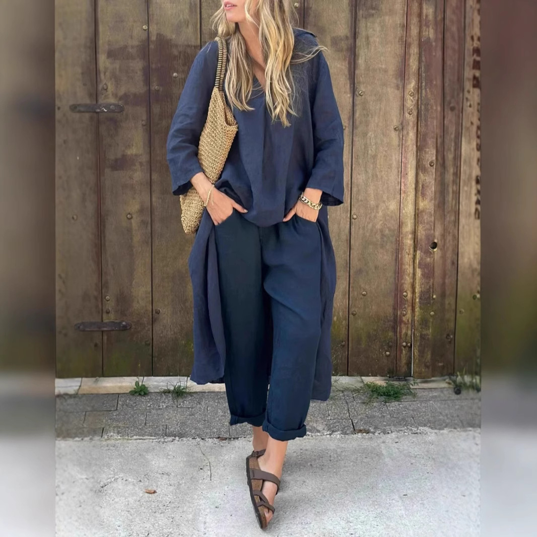 2025 Berdiri Sendiri Pakaian Wanita Katun Linen Kasual Ukuran Besar Longgar Eropa dan Amerika Musim Semi Musim Panas Celana Panjang Lengan Panjang Kerah V Set Dua Potong Warna Solid
