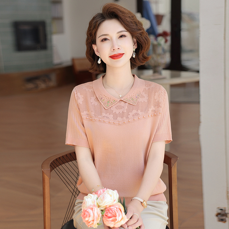 Baju Atasan Ukuran Besar Sutra Es Model Baru Kaus Lengan Pendek Wanita Setengah Baya dan Tua Model Tipis Modis Baju Kecil Rajutan Kerah Terbalik Pakaian Musim Panas Ibu