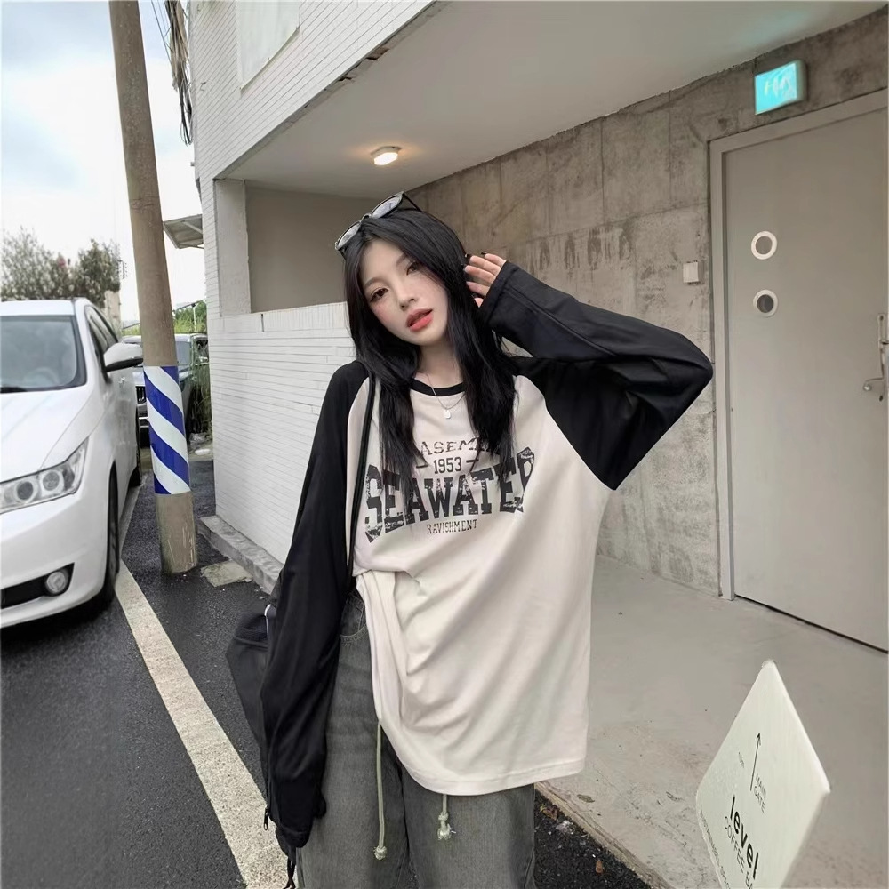 T-shirt Lengan Panjang Wanita Longgar Gaya Korea 2024 Model Baru Lengan Sambung Lengan Bahu Mudah Dipadu Padan Ukuran Besar Kemeja Dalaman Model Setengah Panjang Atasan